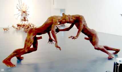 在这个展览中,这些作品在我看来都是僵尸,因为这些作品的造型,它的肌肉都是萎缩的,这实际上让我想起了人类在遇到灾时候的状态。但这里面有一个语言上的悖论。比如说雕塑中间的两个男人角力,这两个貌似在反抗的人,其实他们身体的每一个部位 所透露的都是软弱。包括墙上的这些像呐喊或者像是在干嚎一样的僵尸,类似地狱之门或者是最后的审判。但是它跟罗丹的区别在哪 里呢?罗丹的雕塑是肌肉非常有张力的,而在这样的作品里面我们看 到的不是生命力,而是毁灭。